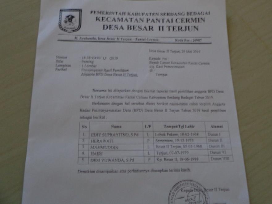 Pada tanggal 27 May 2019… dilaksanakannya pemilihan Berdasarkan aturan dan tatatertib yang disepakati maka menjadi ketentuan Panitia Pelaksana sehingga berkumpulnya tokoh Masyarakat unttuk memilih anggota BPD Desa Besar II Terjun yang sudah mencalonkan dirinya sebagai Peserta.